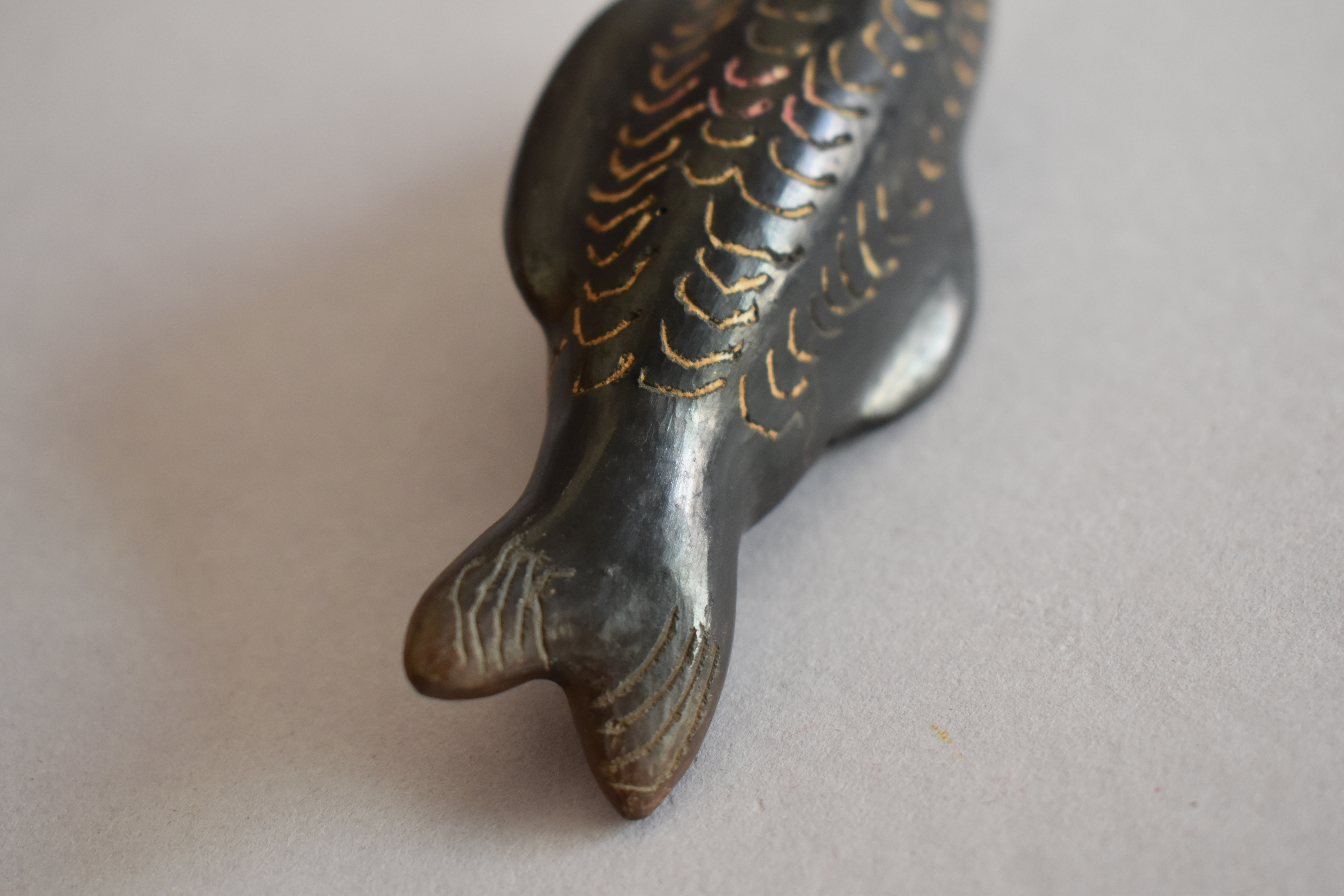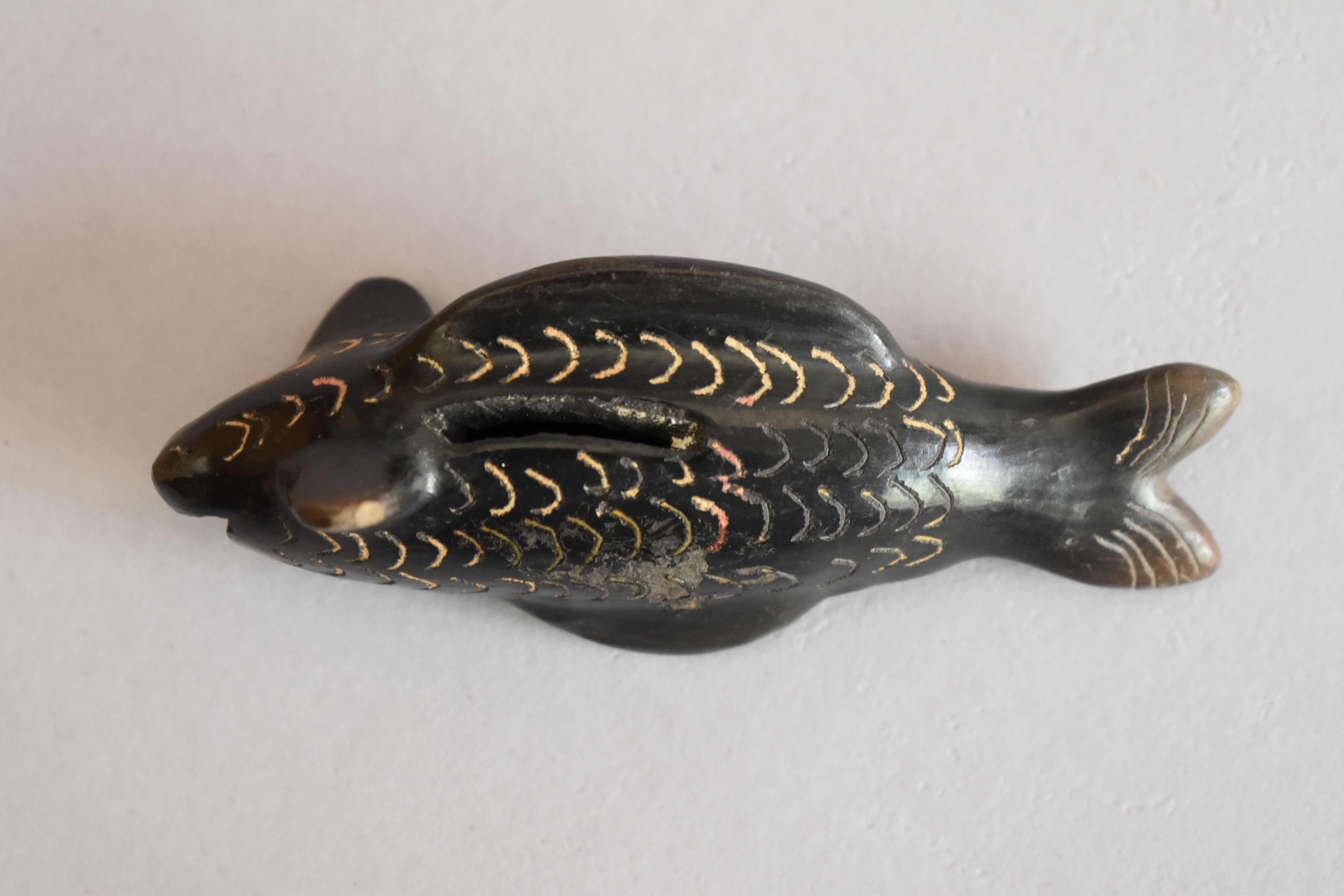 Objeto decorativo. Figura zoomorfa que representa un pez, de superficie bruñida, engobada color negro. Posee un cuerpo alargado que termina en una cola plana dividida en dos, posee aletas modeladas en la zona superior e inferior del cuerpo y a los costados del rostro. Posee un orificio lineal horizontal en la parte ventral del cuerpo, una incisión redonda bajo la aleta inferior y una abertura en la zona inferior del rostro a modo de boca. Presenta decoración incisa de líneas curvas por todo el cuerpo formando escamas en color blanco, además de dos círculos incisos en el rostro, formando un par de ojos y líneas curvas incisas en los extremos de la cola.