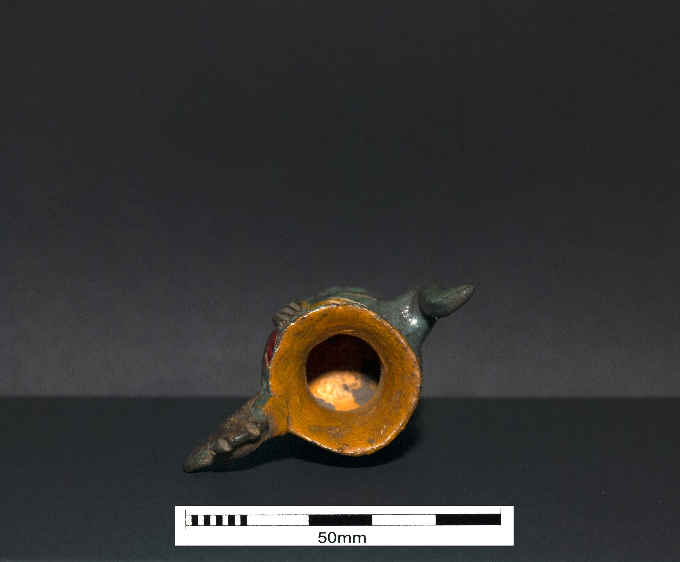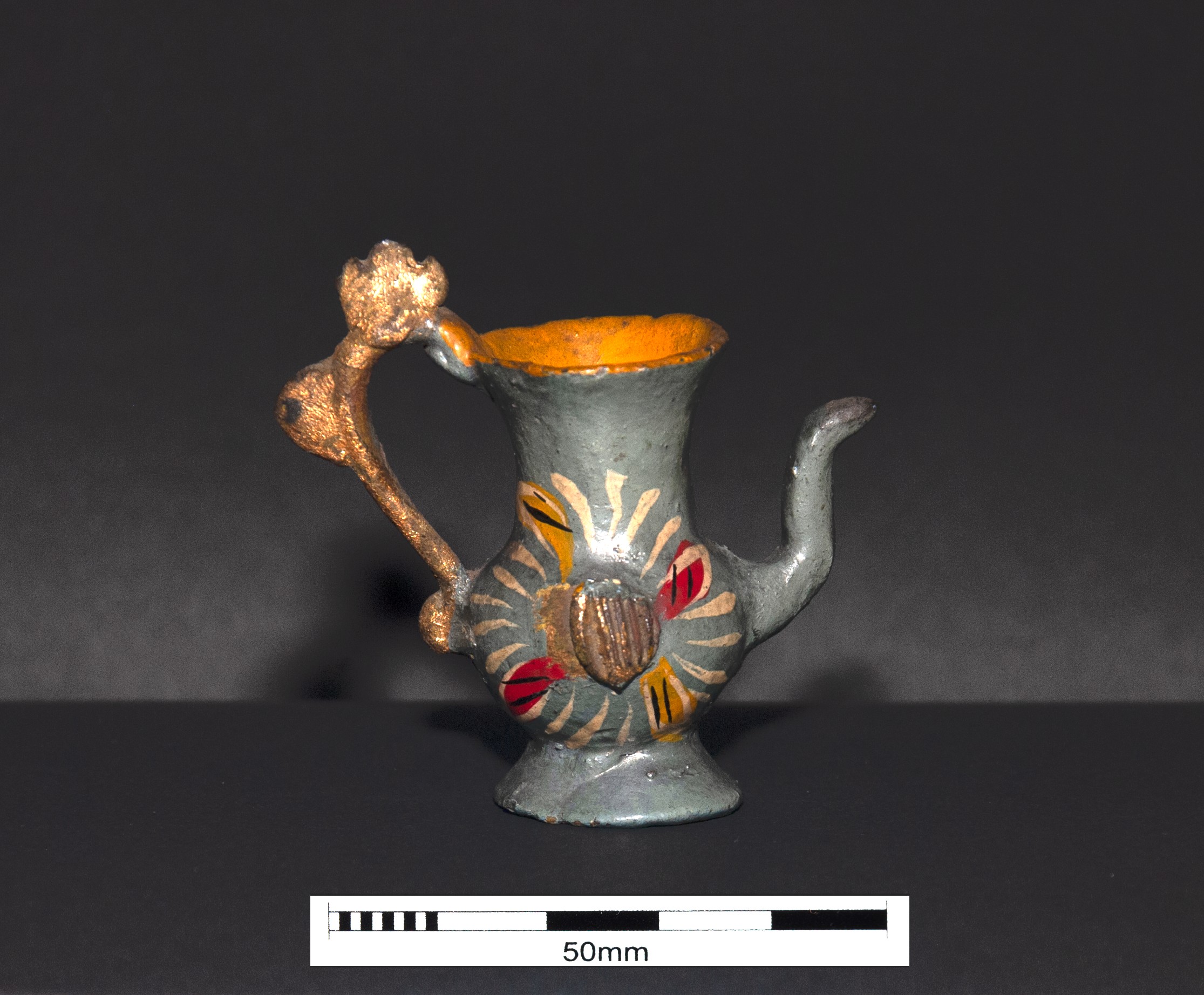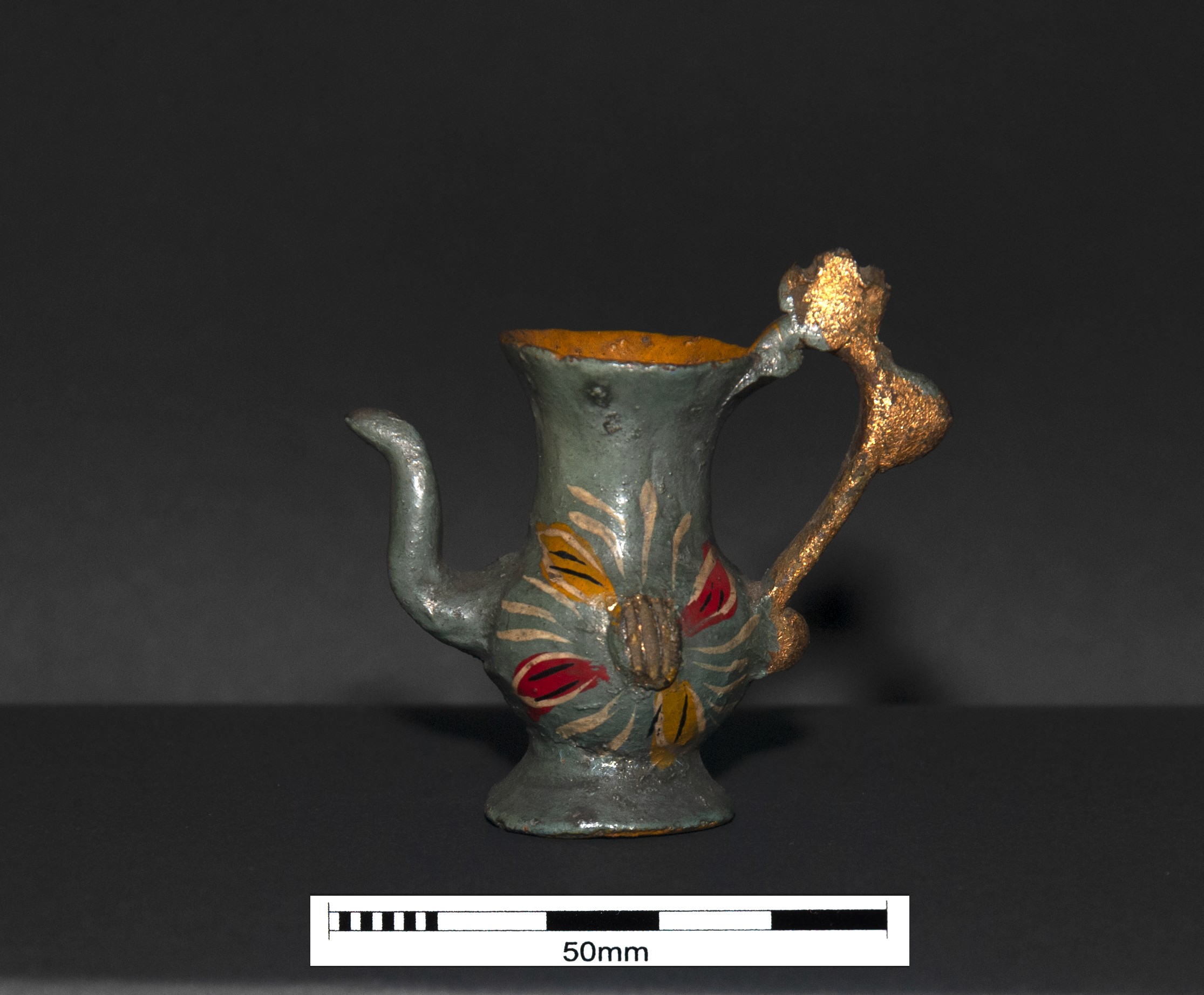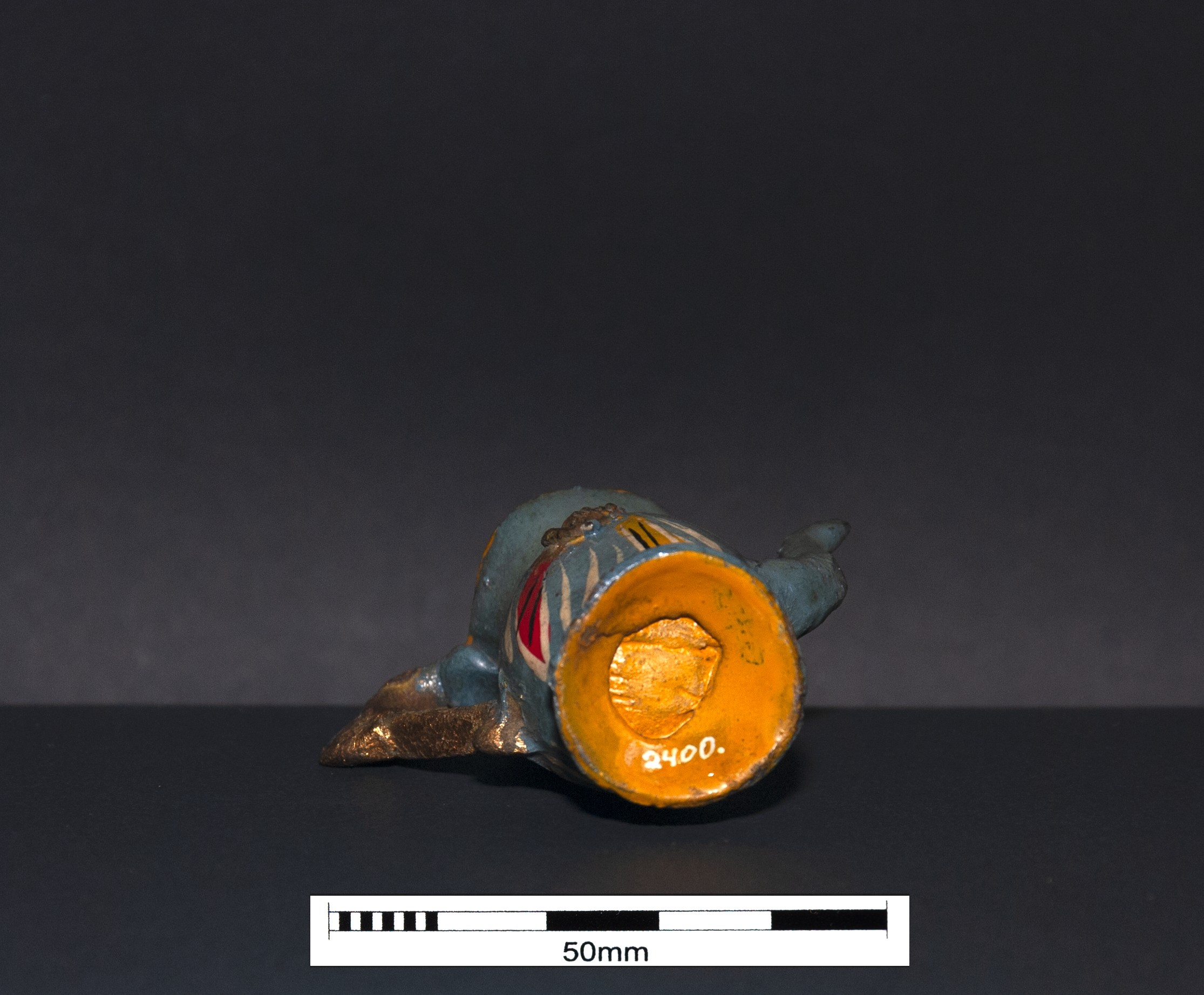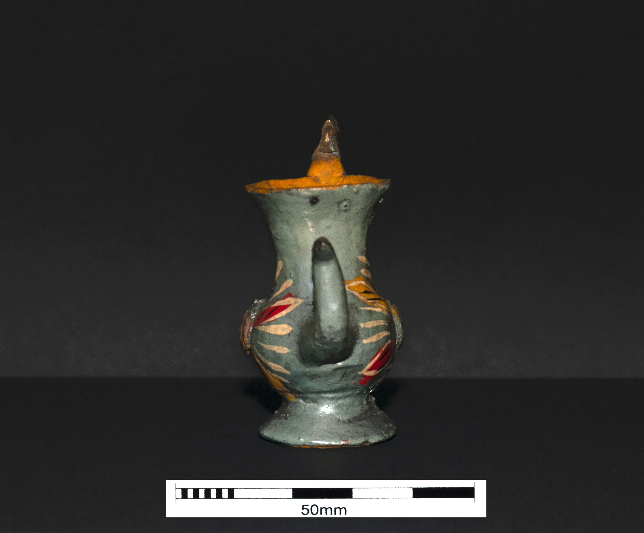 Objeto decorativo de cerámica esmaltada de color turquesa, posee forma de tetera. Está compuesto de un cuerpo globular que se amplía hacia el extremo superior, de donde sobresale un surtidor o pico de forma curva y una base de forma circular, desde el borde superior sobresale un asa que se une al cuerpo, la cual presenta decoración modelada con forma de lazo anudado al medio. El cuerpo por dentro y la base están pintados en color amarillo La pieza tiene decoraciones en tonos amarillo, blanco, negro, rojo y dorado.