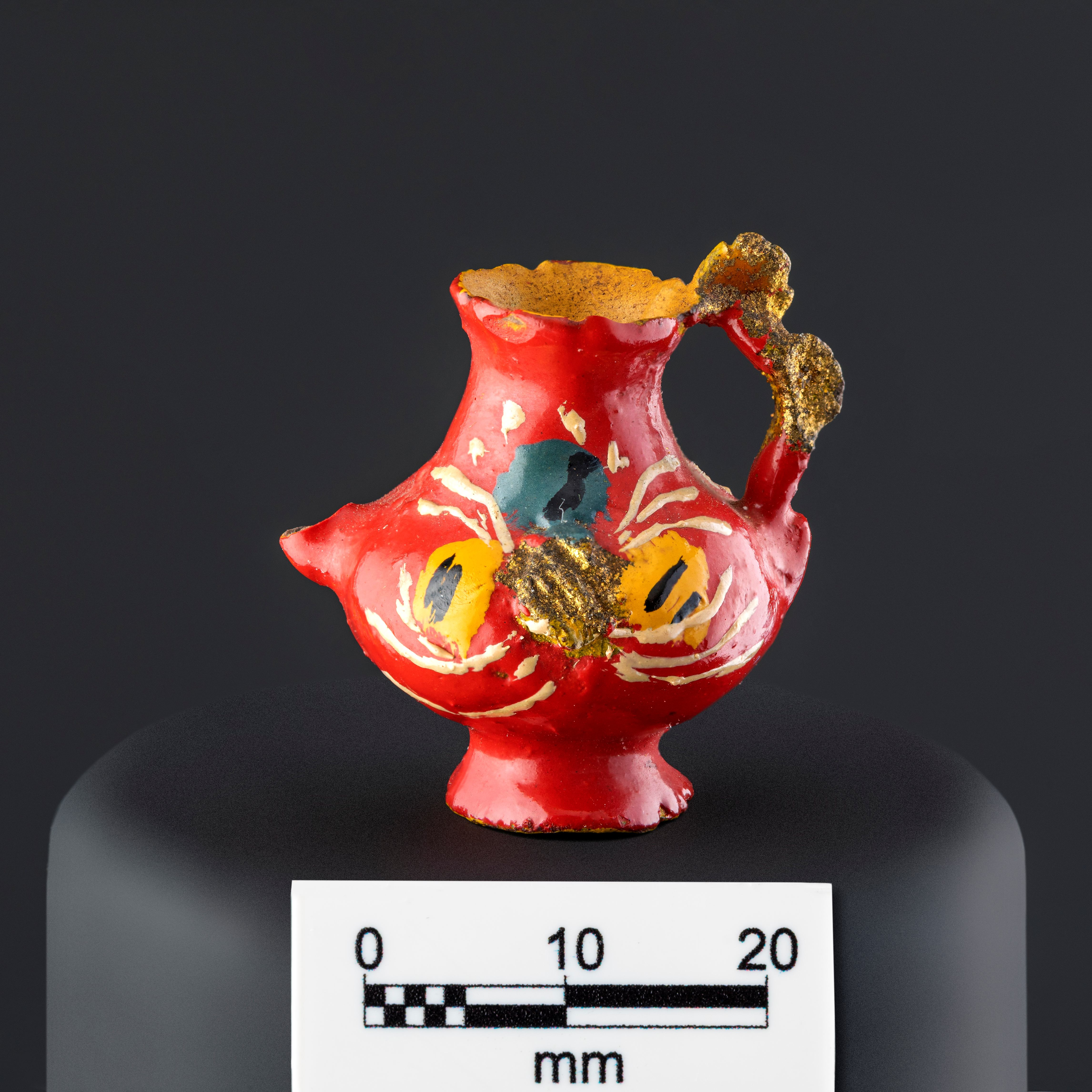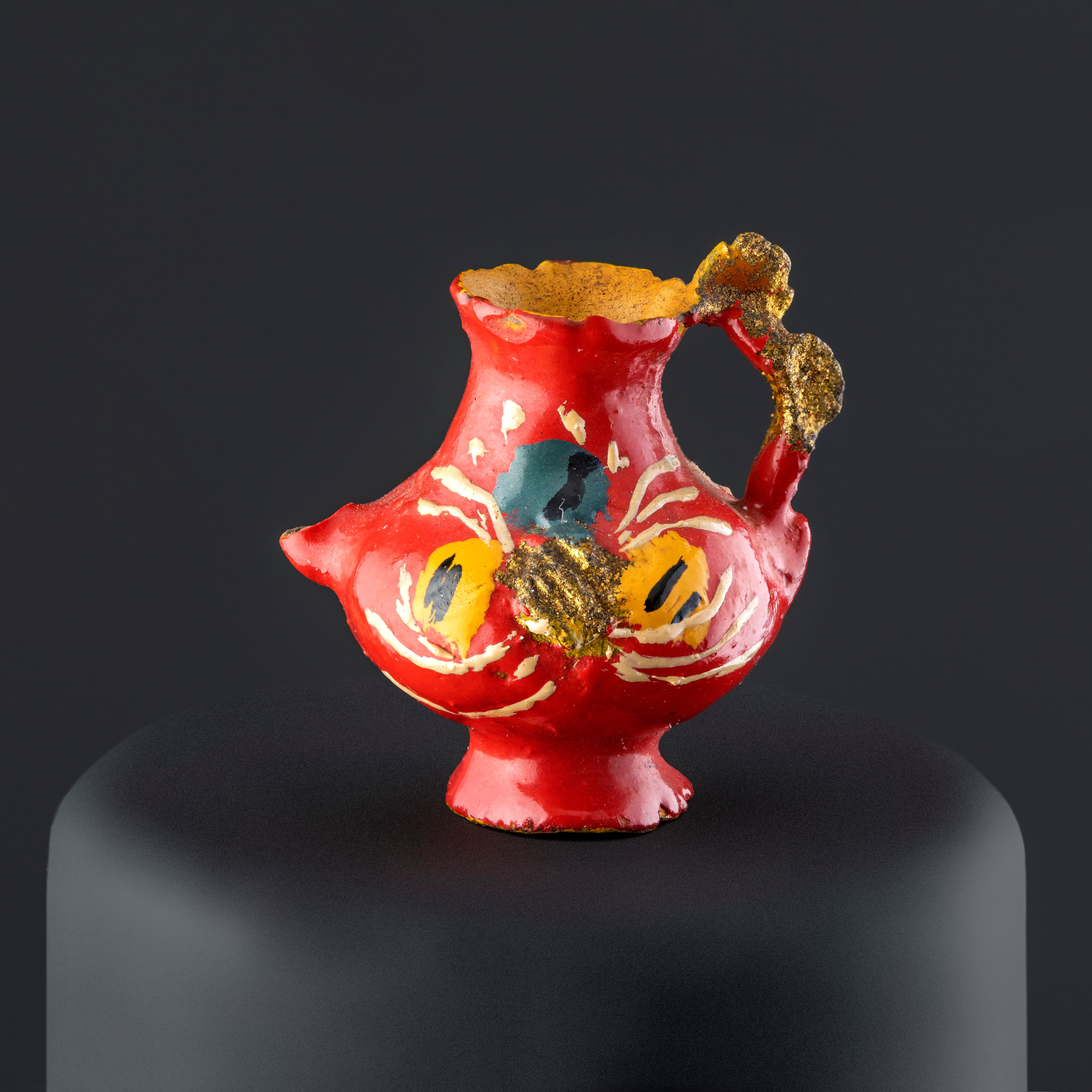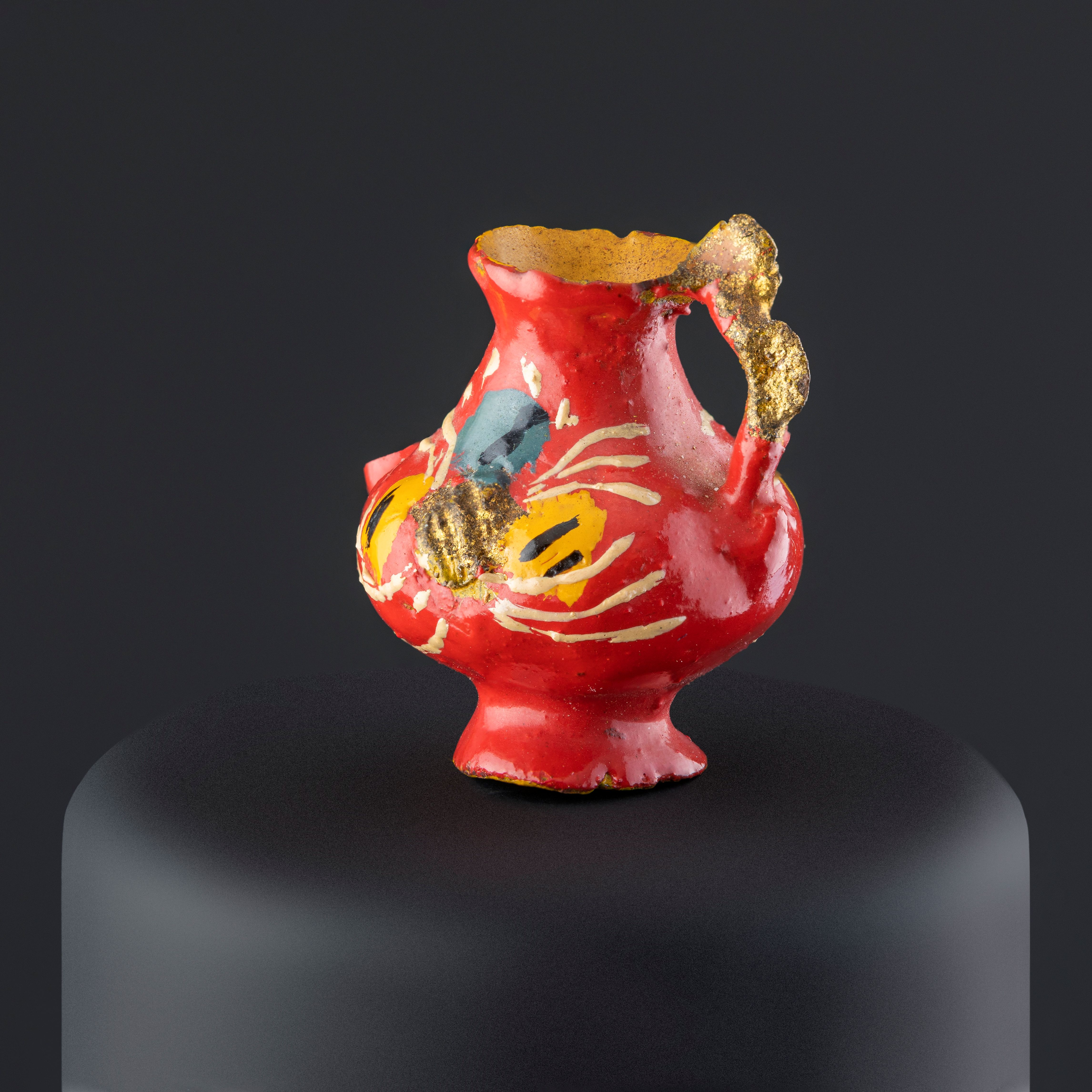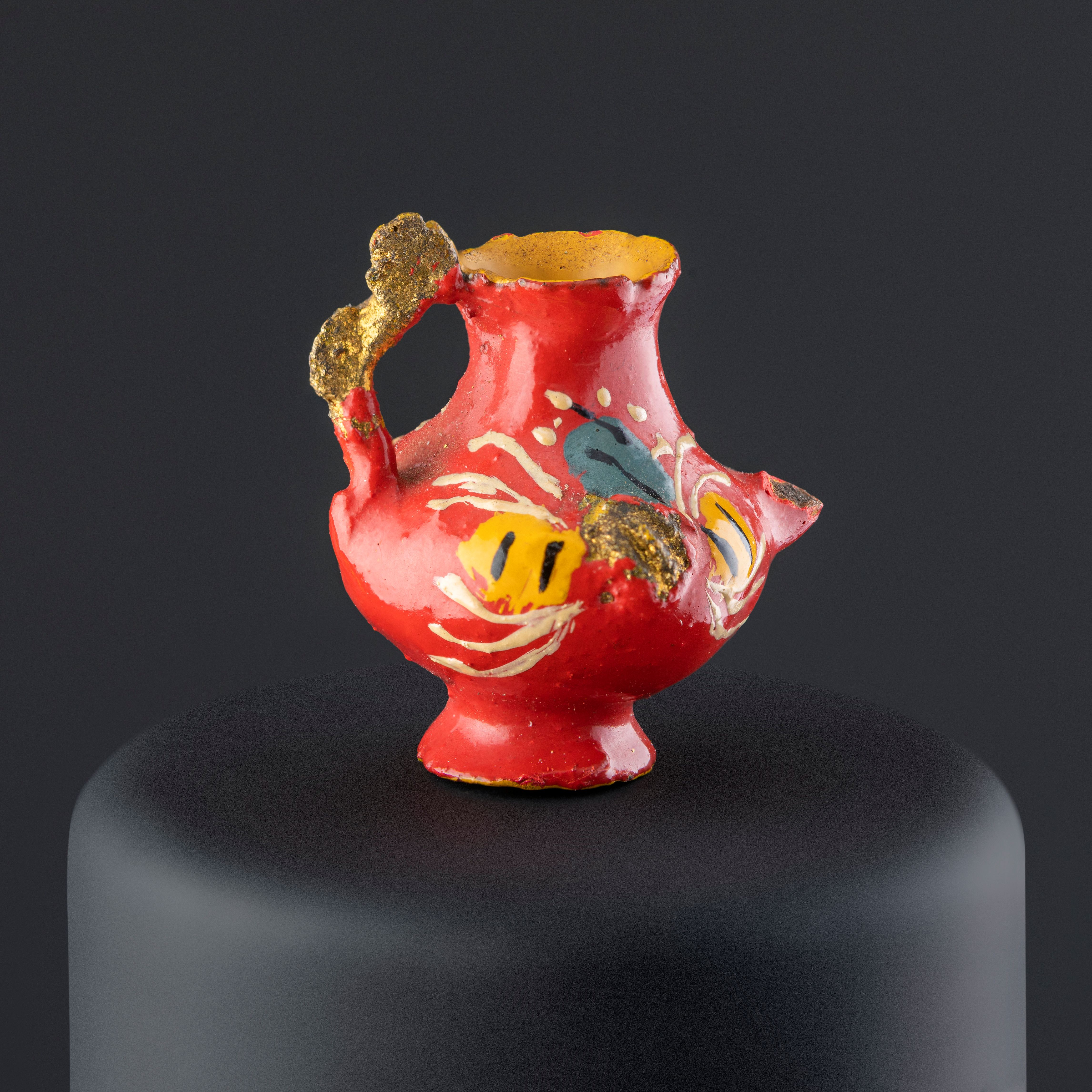 Objeto decorativo de cerámica esmaltada de color rojo. Compuesto de un cuerpo globular que se amplía hacia el extremo superior, sobre este posee una fractura de donde habría sobresalido un surtidor o pico de forma curva y una base de forma circular, desde el borde superior sobresale un asa que se une al cuerpo, la cual presenta decoración modelada en forma de un lazo anudado al medio. El cuerpo por dentro y la base están pintados en color amarillo. La pieza tiene decoraciones en tonos amarillo, blanco, negro, gris y dorado.