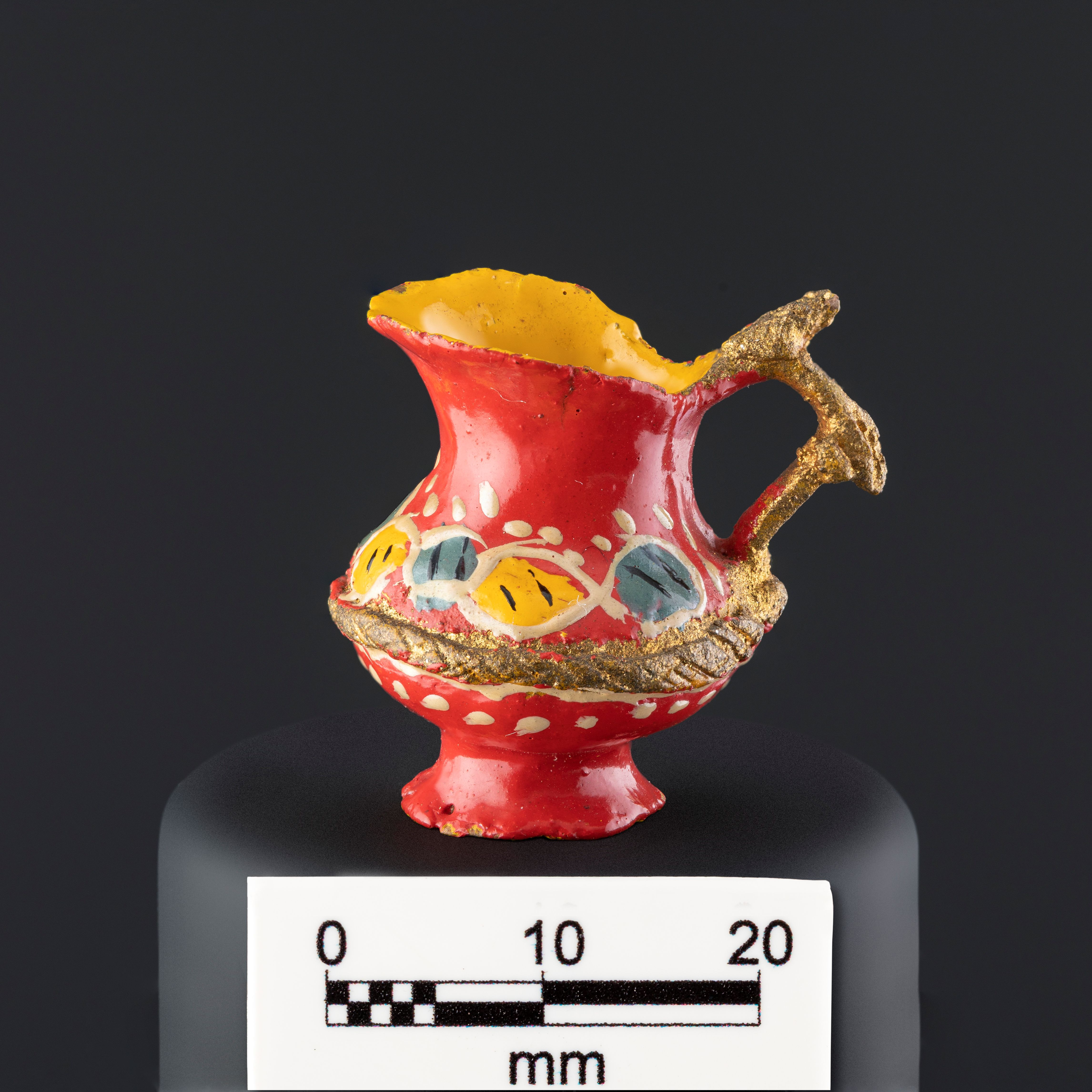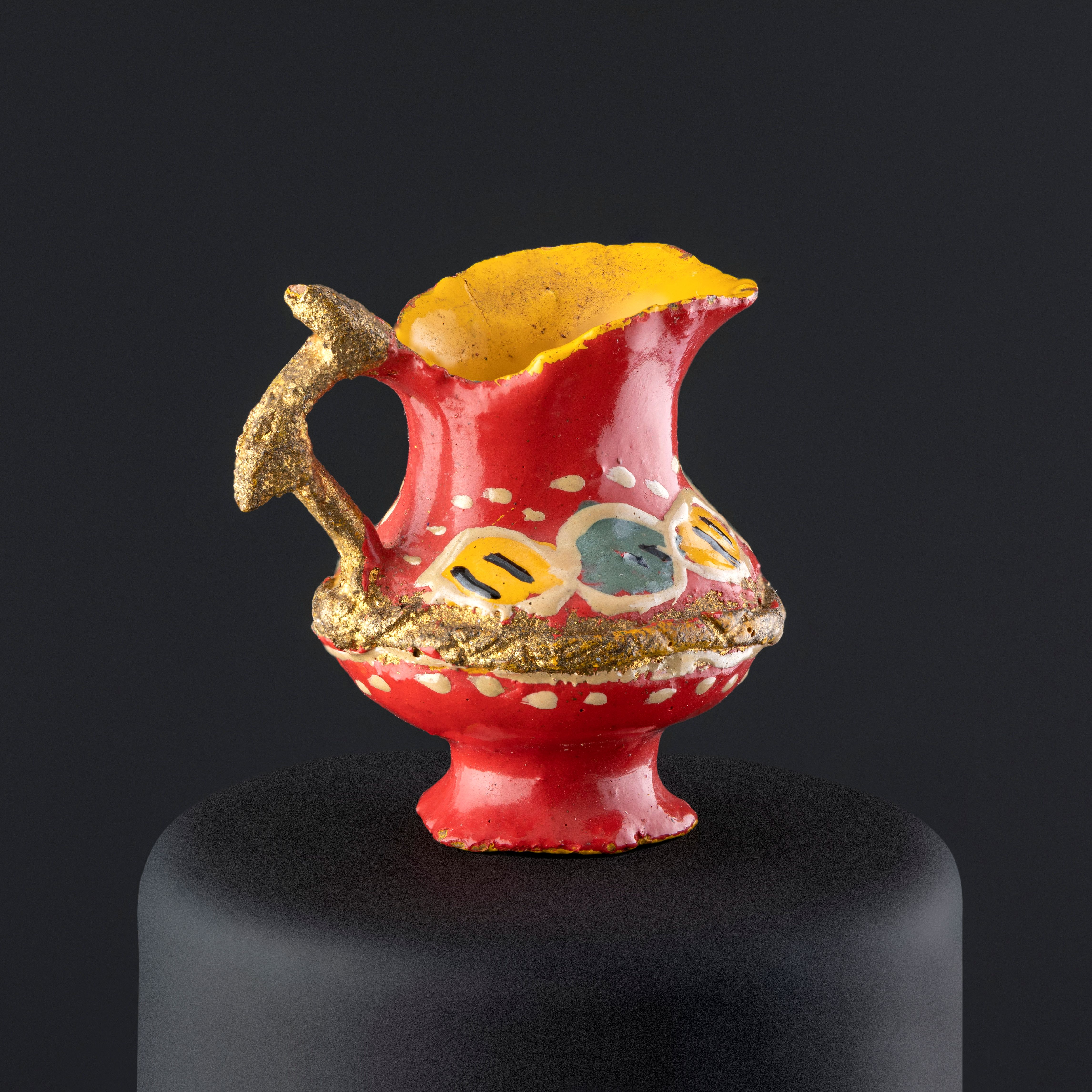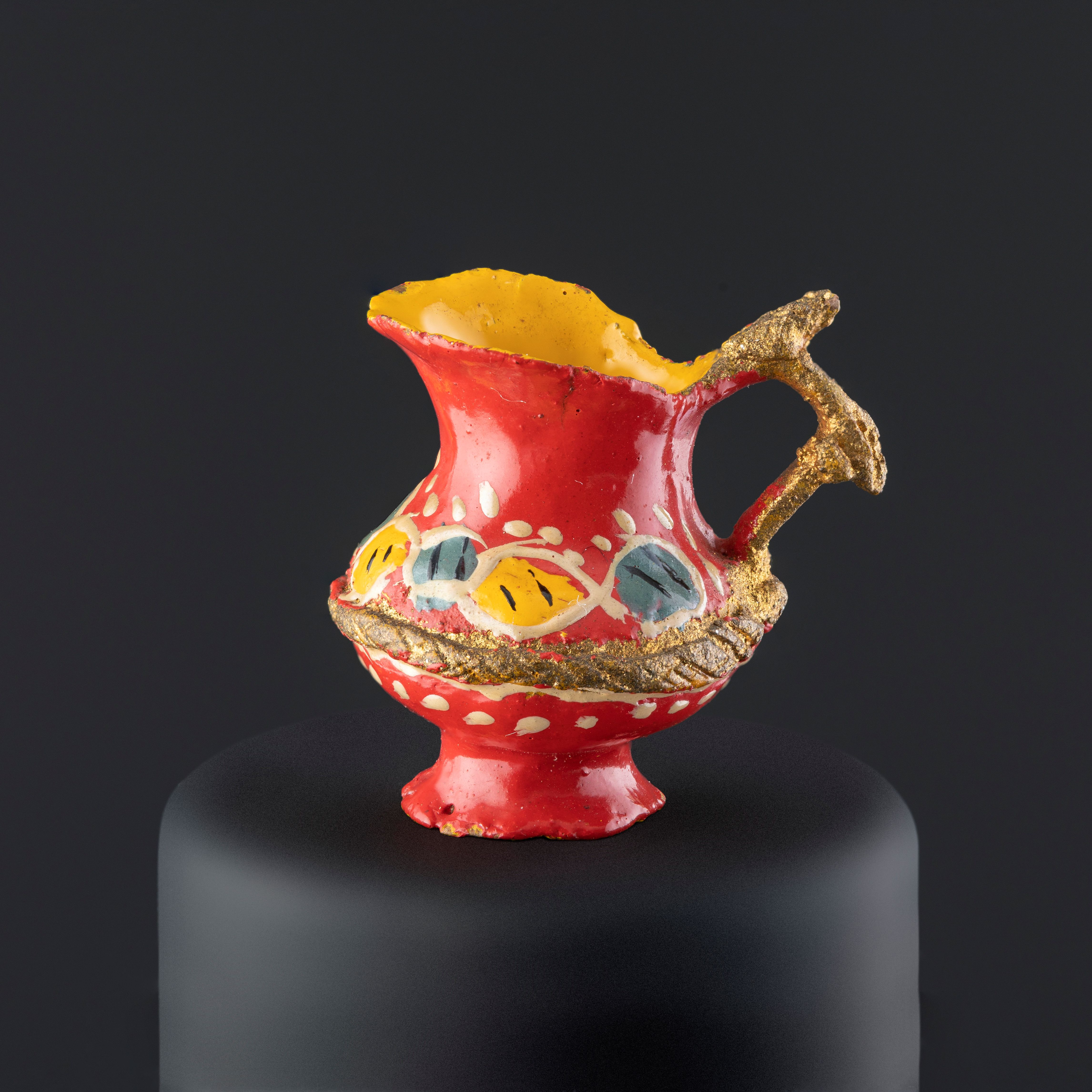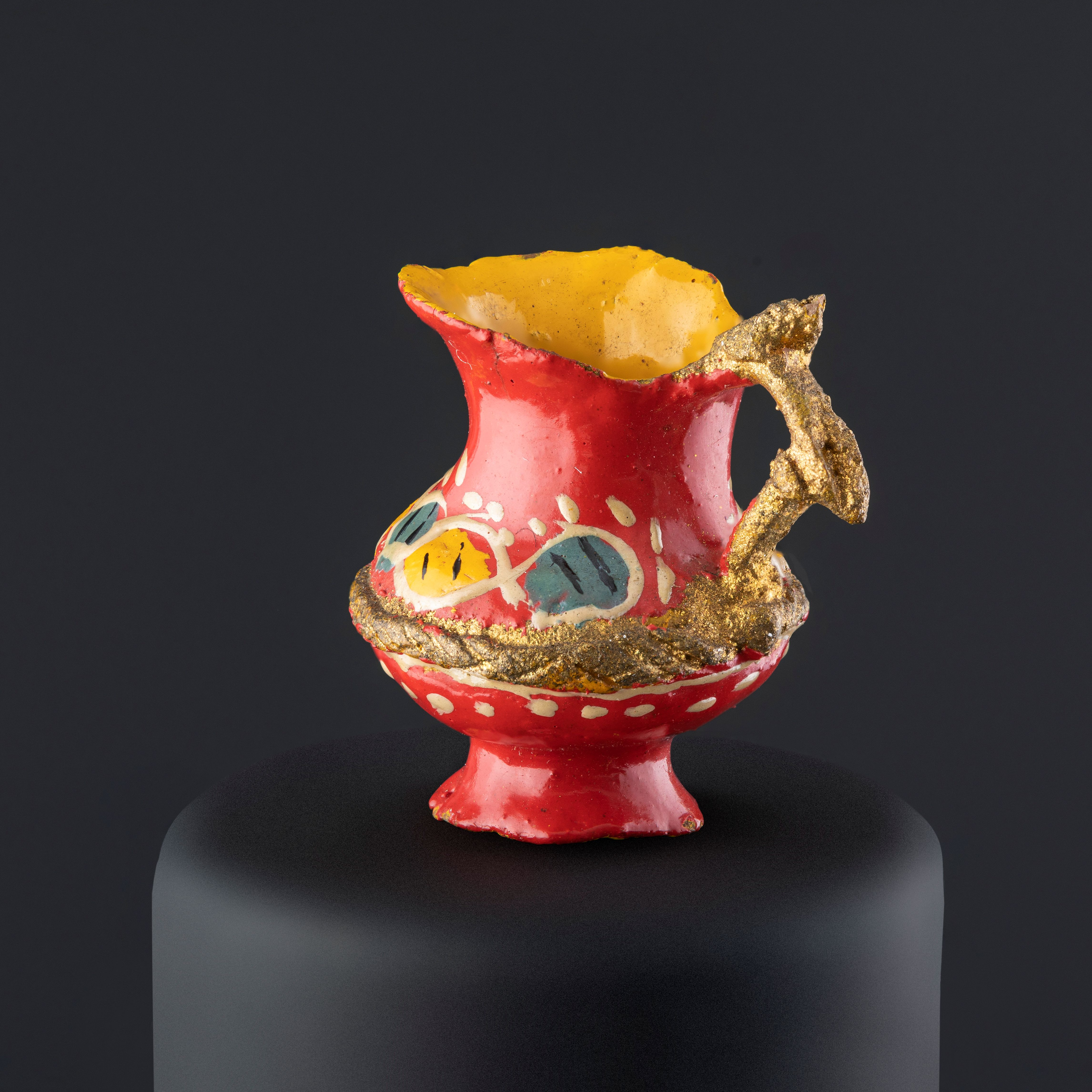 Objeto decorativo de cerámica esmaltada de color rojo. Compuesto de un cuerpo globular que se amplía hacia el extremo superior, desde el borde superior sobresale un asa que se une al cuerpo, la cual tiene decoración modelada con forma de dos hojas color verde, el otro extremo del borde se alarga formando una abertura a modo de surtidor amplio. El cuerpo por dentro y la base están pintados en color amarillo. La pieza tiene decoraciones en tonos amarillo, blanco, verde, negro, gris y dorado.