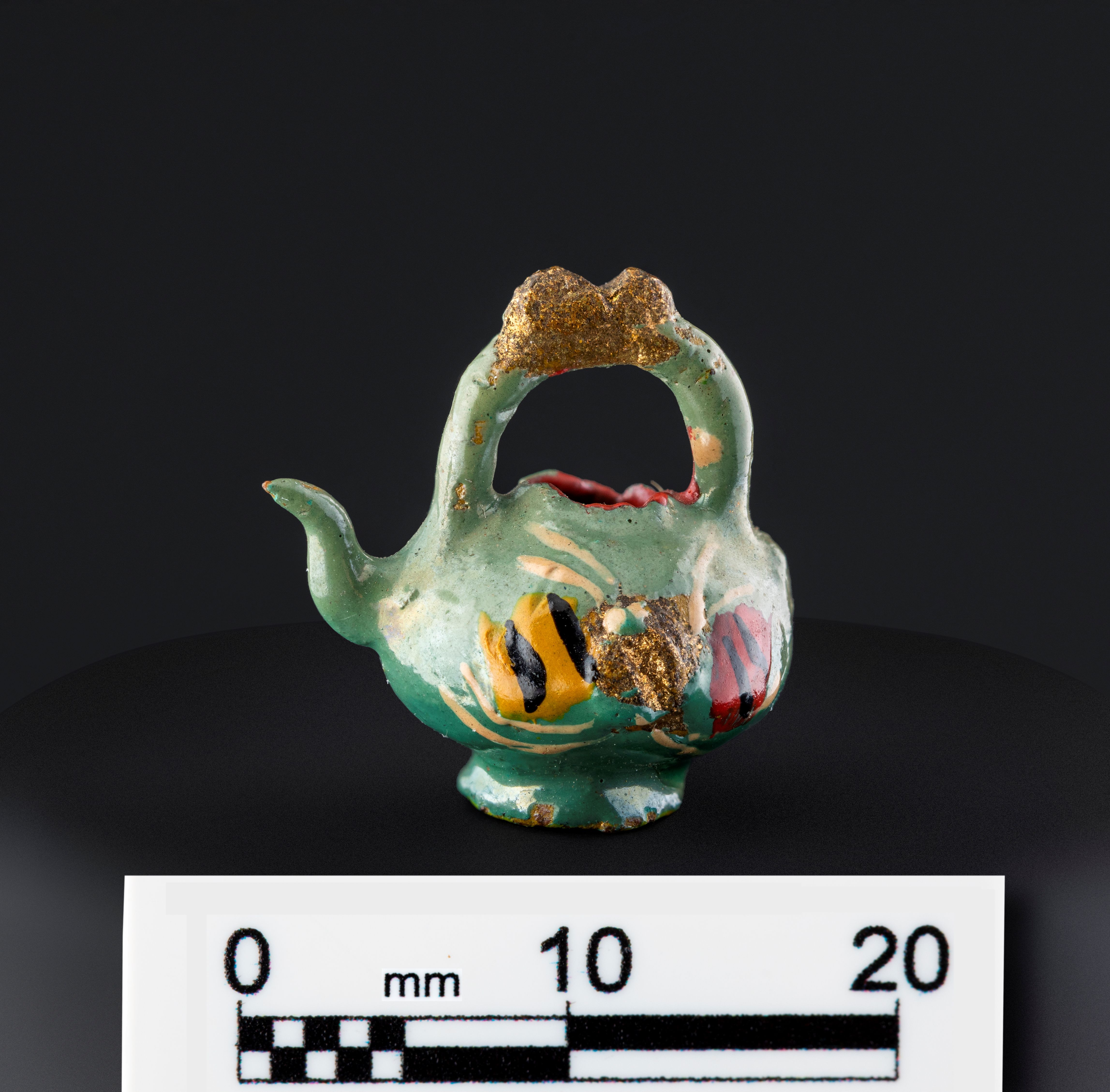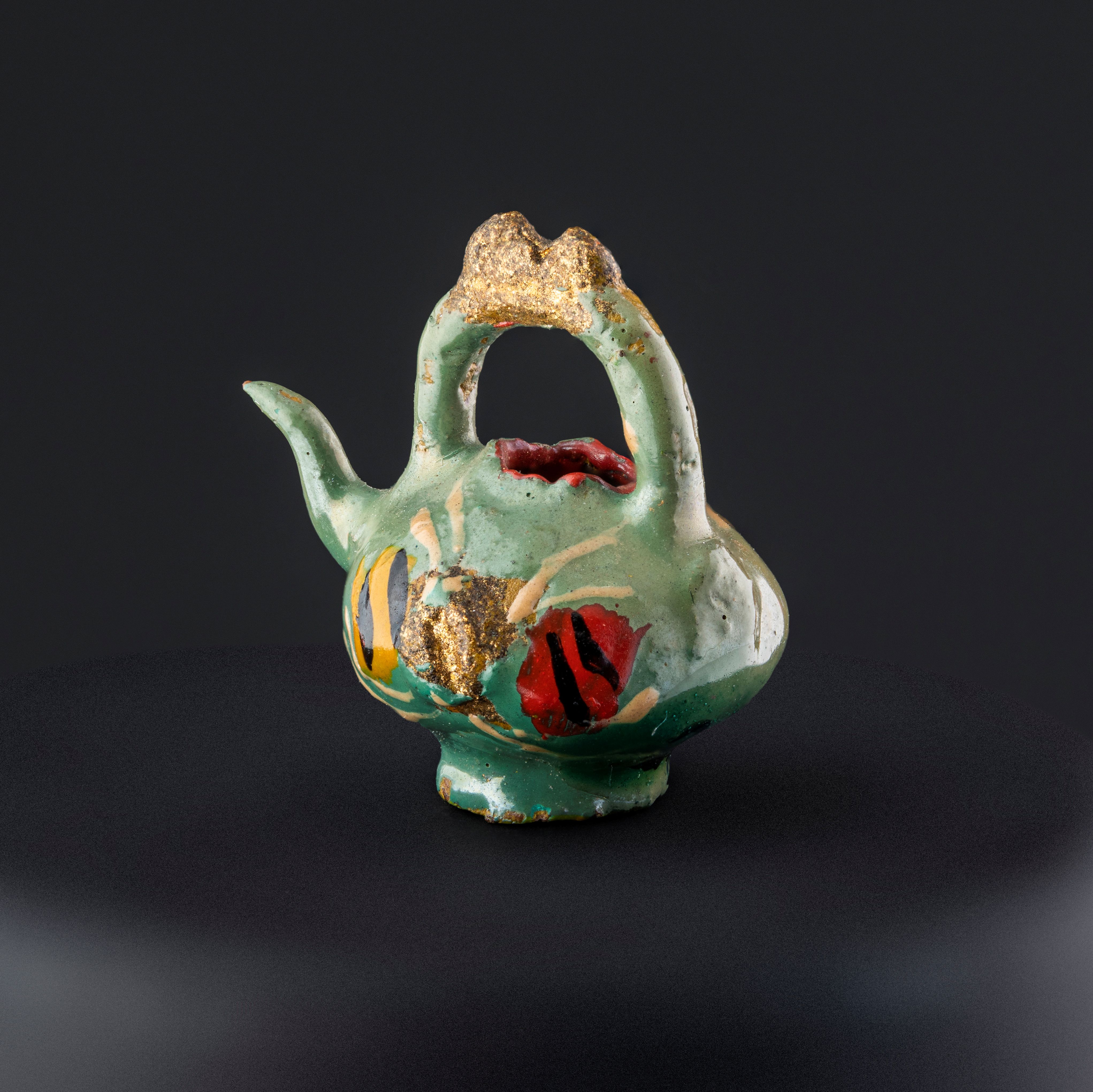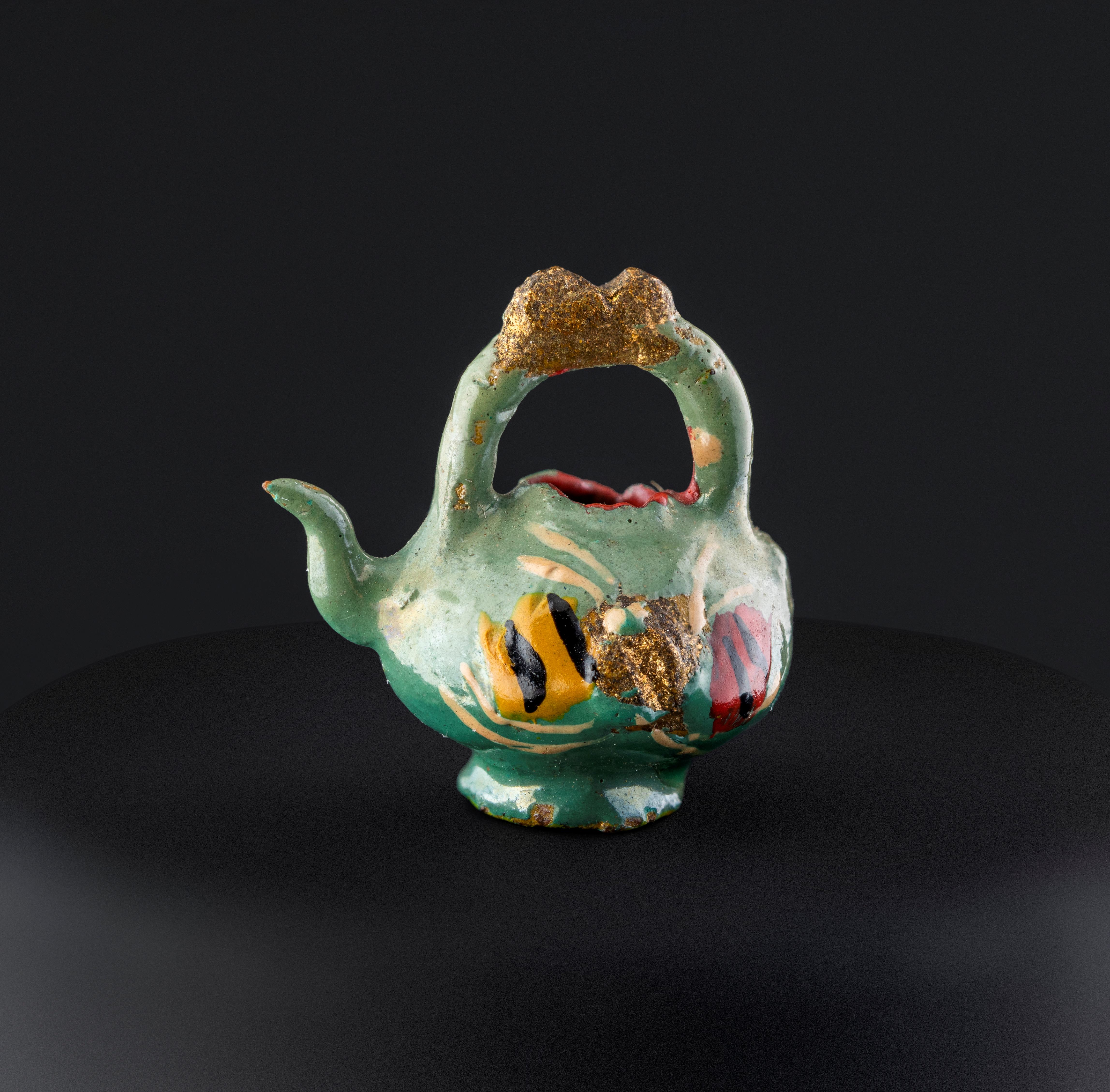 Objeto decorativo de cerámica esmaltada de color turquesa. Posee forma de tetera. Está compuesto de un cuerpo globular, de donde sobresale un surtidor o pico de forma curva y una base de forma circular, desde un extremo del borde superior sobresale un asa que se une al extremo del borde frontal, la cual presenta decoración modelada. La base de la pieza está pintada en color amarillo. La pieza tiene decoraciones en tonos amarillo, blanco, negro, rojo y dorado.