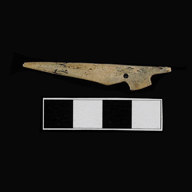 Objeto de forma alargada con ambos extremo aguzados, uno de ellos recto y otro con un mamelón rectangular a modo de vástago. Superficie de color marfil con manchas rosa, pulido.
