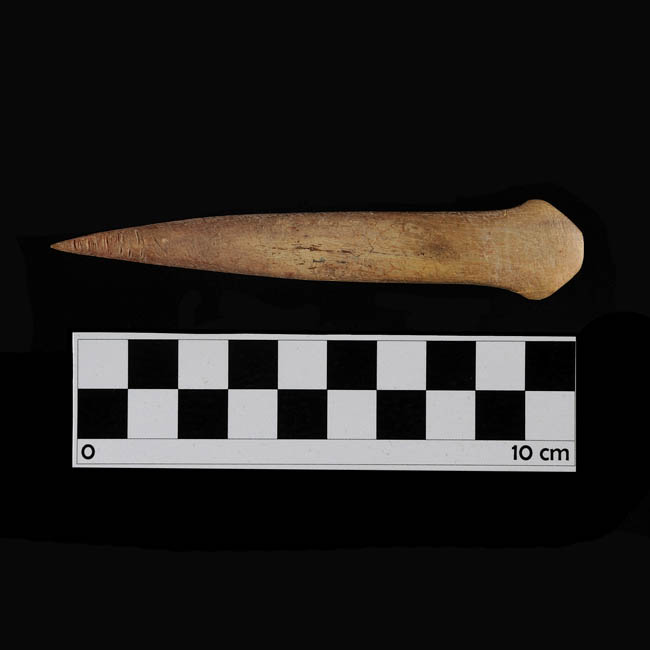 Objeto de forma alargada con uno de sus extremos aguzados y otro plano. De color marrón claro con manchas oscuras. Superficie pulida.