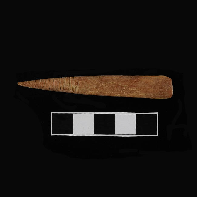 Objeto de forma alargada y semi curva con uno de sus extremos aguzados y otro plano. De color marrón oscuro. Superficie pulida con sectores porosos y marcas de inserción.