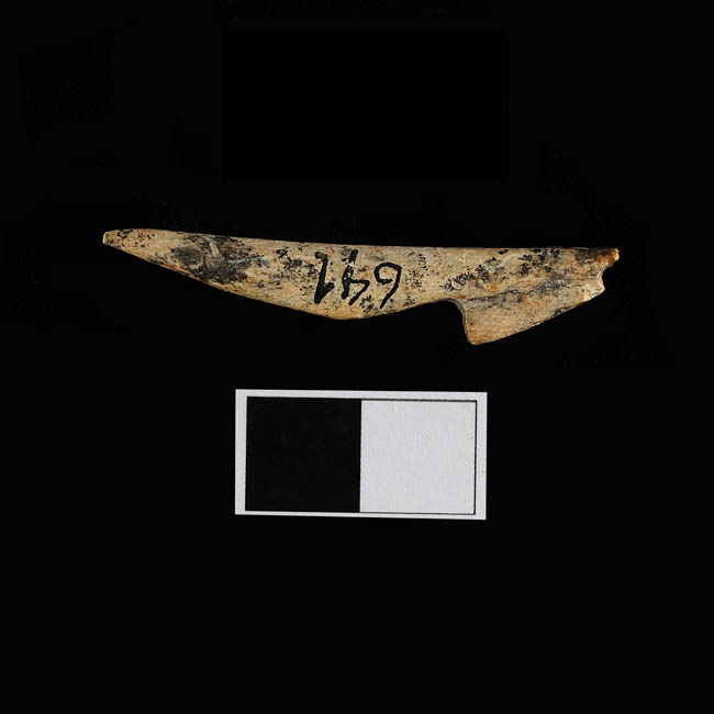 Objeto de forma alargada semiplana con ambos extremos aguzados y ligeramente curva. El sector medio es más ancho, mientra que uno de sus extremos aparece aplanado para conformar un vástago de inserción. Color marfil con manchas gris oscuro, superficie brillante con sectores porosos.