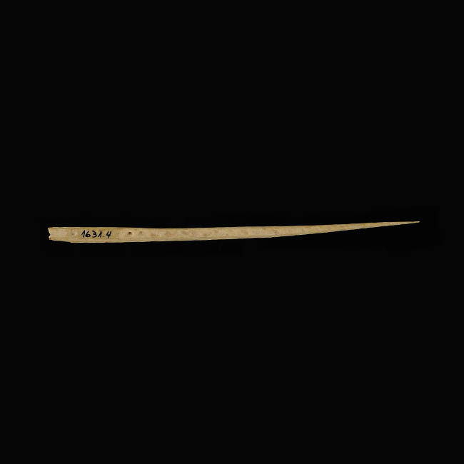 Objeto de forma alargada con ambos extremos aguzados. Superficie pulida y brillante de color marfil.