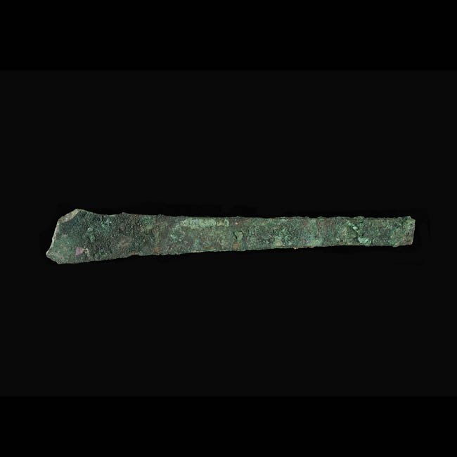 Objeto de forma alargada. Posee un sector proximal más ancho y un sector distal fragmentado. De color verde y marrón con óxido, adherencias y faltantes.