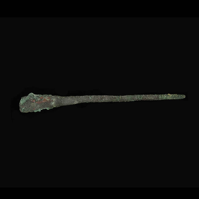 Objeto de forma alargada. Posee un sector proximal más ancho y de bordes irregulares, y un sector distal en punta. De color verde y marrón con óxido, faltantes y adherencias.
