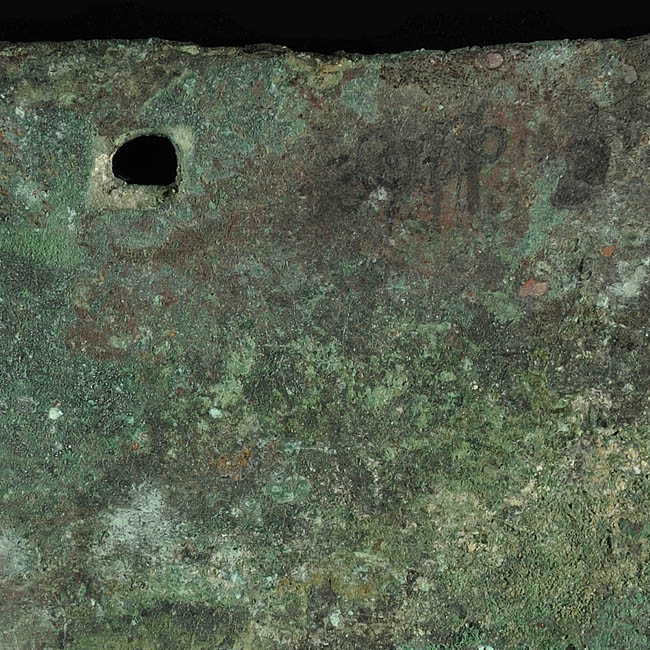 Objeto de forma rectangular semiplana de bordes irregulares, posee una perforación en el centro del borde superior. Superficie rugosa de color marrón con manchas de de óxido verde.