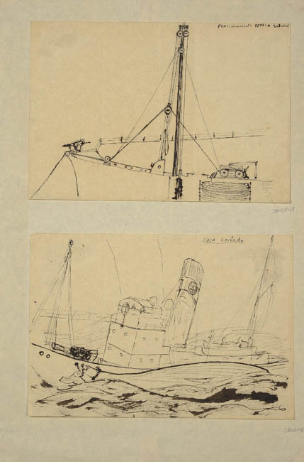 Obra bidimensional monocromática de formato rectangular, composición en base a una embarcación dispuesta de costado. Al centro de la embarcación una construcción en altura y un cañón, dispuestos perpendicularmente a la cubierta. Al costado de la embarcación un cetáceo con la cola cortada.
