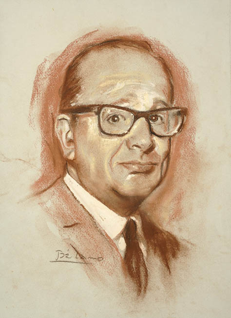 Obra bidimensional monocromática de formato rectangular, composición en base a busto masculino. Rostro orientado hacia la derecha, semicalvo y lleva lentes. Viste camisa, chaqueta y corbata.