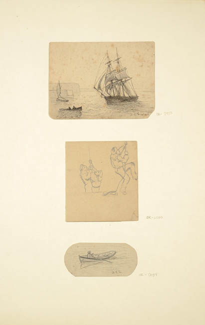 Obra bidimensional monocromática de formato rectangular. Composición en base a embarcación liviana a remos, con figura humana sentada de espaldas en su interior, viste sombrero de ala redonda.