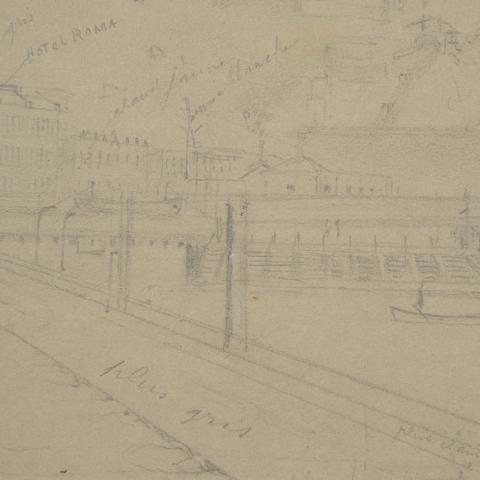 Obra bidimensional monocromática de formato rectangular, composición en base a paisaje porteño. Compuesto por una vía al costado izquierdo dispuesta diagonalmente, a su costado dos botes a remo, tras ellas construcciones de media altura. En la mitad izquierda en la parte superior de la obra construcciones. Textos manuscritos asociados a las figuras.