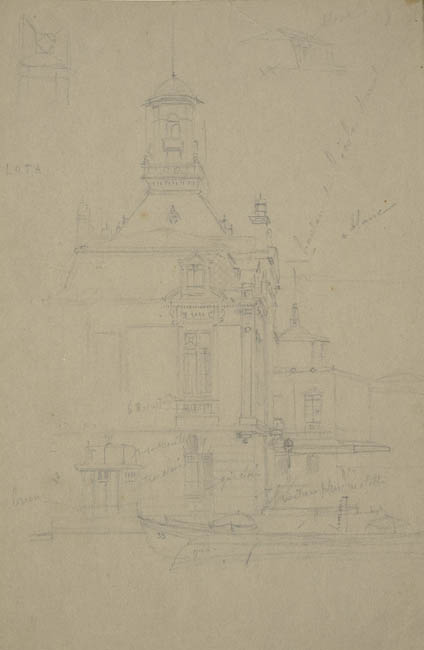 Obra bidimensional monocromática de formato rectangular, composición en base a edificación vista de costado, de dos pisos con una torre. En el costado visible tiene en el primer piso dos puertas y en el segundo una ventana. El frente tiene un remate. Al costado derecho una construcción de menor altura con un torreón. Texto asociado a las partes de las construcciones,