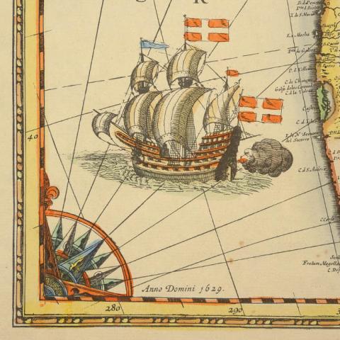 Objeto usado como representación bidimensional y a escala de una porción de la superficie terrestre. Composición en base a una forma de contornos irregulares formado por lineas ondulantes de colores, letras impresas, números, embarcaciones y figuras zoomorfas. En el ángulo inferior derecho una cartela con texto en su interior flanqueada por tres figuras humanas por cada lado, en la parte superior vegetales, dos figuras zoomorfas y dos aves.