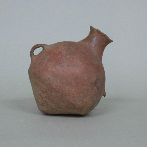 Contenedor restringido de perfil compuesto. Tiene labio irregular, cuello cóncavo, cuerpo globular y base apuntada. Posee dos asas anulares de orientación vertical en el cuerpo. Superficie alisada, pulida y bruñida de color rojo.