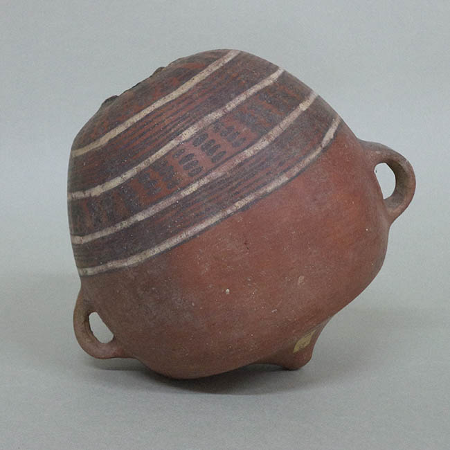 Contenedor restringido de perfil compuesto, Tiene Cuerpo ovalado y base apuntada. En la parte baja del cuerpo tiene dos asas cinta contrapuestas de orientación vertical en la parte baja del cuerpo. Se encuentra decorada con pintura lineal y figurativa en bandas horizontales de color negro y blanco con diseños en camélidos de color negro en filas ordenadas desde la base hasta el remate del cuerpo. Superficie alisada, pulida y engobada de color rojo.