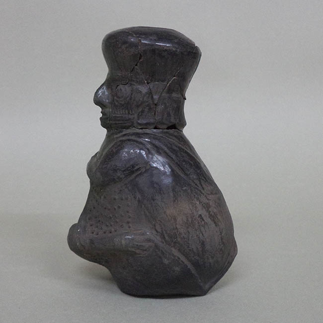 Contenedor restringido de perfil compuesto. Tiene labio redondeado, cuello abultado y se encuentra modelado con una figura humana sedente con una pierna recogida y otra doblada. Uno de los brazos de la figura se encuentra extendido y el otro sostiene el hombro. EL rostro tiene rasgos pronunciados con nariz y barbilla prominente y ojos redondos, y en las comisuras de la boca se observan adornos pintados o joyas alargadas incisas. El cuerpo se encuentra cubierto por un ropaje realizado en pastillaje con pequeñas adiciones circulares en el sector frontal. Superficie alisada, pulida y bruñida de color negro brillante OB Se encuentra fragmentada y pegada con algunos faltantes en la parte superior y labio.
