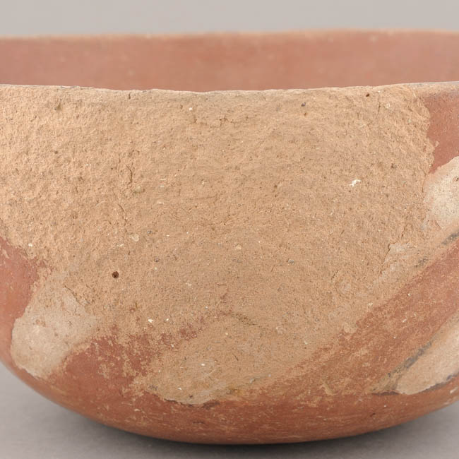 Contenedor abierto de perfil simple. Tiene labio redondeado, cuerpo troncocónico invertido y base plana. Superficie alisada y pintada de color rojo interior y exterior. Tiene decoración exterior pintada en forma de gruesas líneas blancas inclinadas bordeadas de negro.