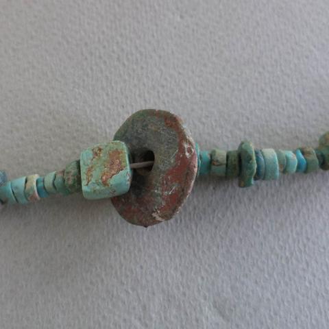 Adorno de uso personal que se usa en torno al cuello y pendiente sobre el pecho. Objeto formado por múltiples cuentas discoidales y tubulares de diferentes tamaños perforadas y unidas por un hilo, elaboradas en piedra de color verde y azul.