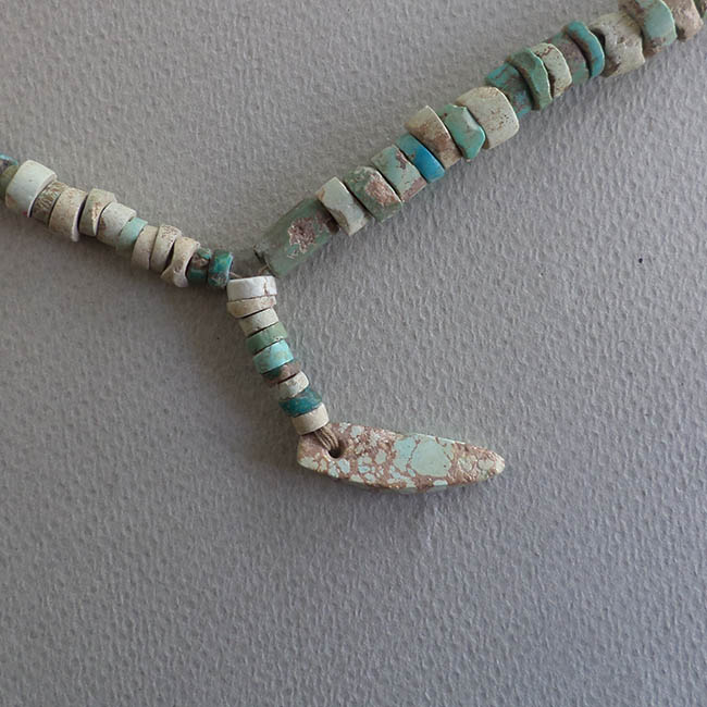 Adorno de uso personal que se usa en torno al cuello y pendiente sobre el pecho. Objeto formado por múltiples cuentas discoidales y tubulares perforadas y unidas por un hilo, elaboradas en piedra de color verde y blanco. En la parte inferior tiene un pendiente de forma alargada con punta.