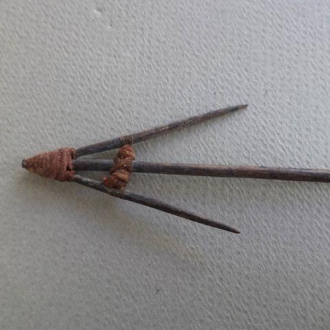 Instrumento usado en la pesca. Objeto alargado conformado por una varilla metálica fina de perfil circular y dos vástagos a cada lado que conforma una punta. Se encuentran unidos por medio de amarres firmemente ajustados y en la porción proximal se observa otro amarre que sostendría el sedal. Superficie rugosa de color gris verdoso.