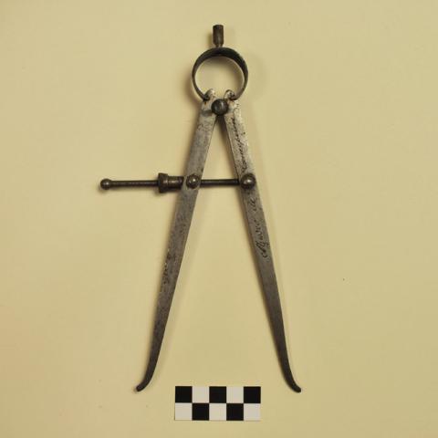 Compás de puntas. Instrumento metálico, está compuesto por dos brazos articulados por una bisagra y resorte circular con un mango remachado en su extremo superior. Los brazos están unidos mediante un tornillo y tuerca regulables. Presenta la inscripción "Museo de Concepción".