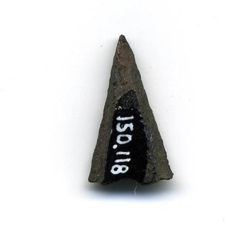 Pequeño fragmento de forma triangular de un artefacto de hueso, de uso desconocido. Se encuentra quemado.