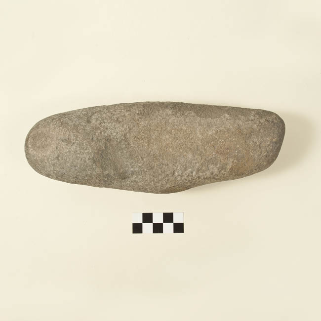 Instrumento lítico de forma cilíndrica irregular y bordes redondeados. Superficie lisa. Está elaborado en piedra tallada y pulida. De color grisáceo claro.