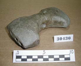 Instrumento sonoro de viento. Su cuerpo asemeja a una forma trapezoidal con sus extremos superior e inferior recto y de mayor extensión que la zona media, para facilitar la sujeción del objeto, elaborado en piedra tallada. En la parte superior tres orificios. Superficie lisa de color gris y negra.