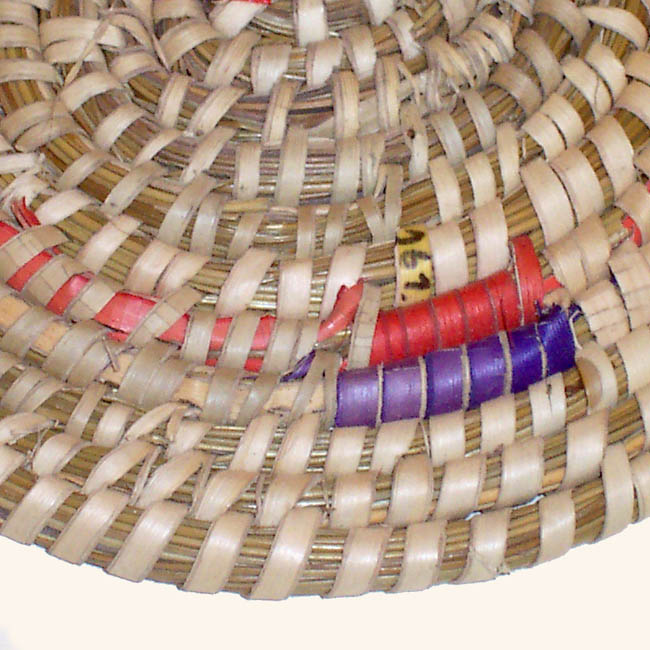 Pieza circular pequeña, tejida en espiral con fibras vegetales coirón y chupón