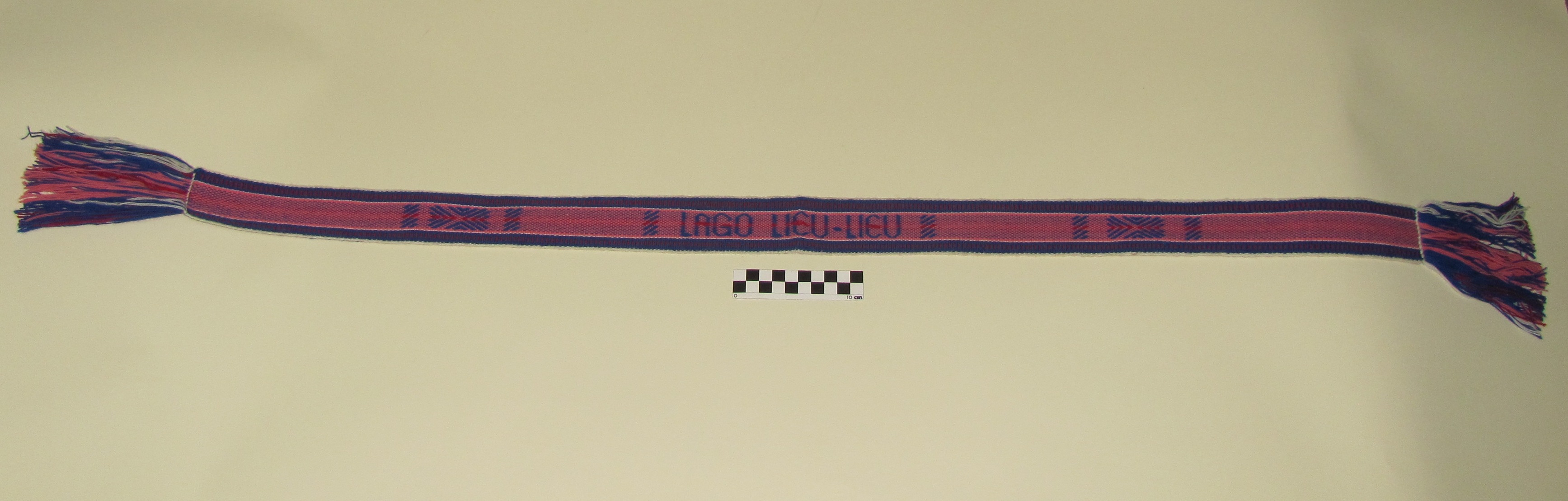 Faja de lana con flecos en ambos extremos. En los bordes es de color azul y el centro, de mayor grosor, es de color rosado con letras azules que dicen “LAGO LlEU-LlEU” además de líneas decorativas en el mismo color.