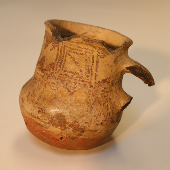 La característica principal de esta pieza es que presenta la mayor parte de la superficie exterior decorada con trazos lineales que conforman motivos geométricos de color rojo sobre engobe blanco; cuerpo con forma que propende a ser esférica, el cuello es cilíndrico y la base convexa. Posee un asa tipo cinta, con una parte faltante, pero que denotan en las partes preexistentes su inserción en la parte superior del cuerpo y en el sector inferior del borde.