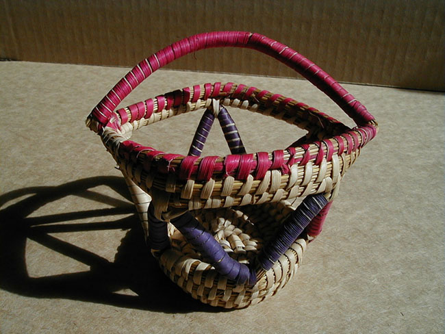 Canasto en miniatura tejido en fibras vegetales, de paredes caladas, el borde y parte del calado llevan colores azul y rojo.