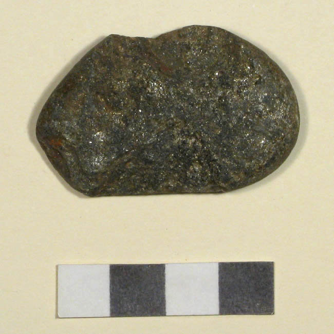 Instrumento lítico usado en faenas de pesca. Tiene forma ovalada irregular, de sección semi plana y bordes redondeados. Tiene una depresión lateral en el sector central. Está elaborado en piedra tallada y pulida de color gris oscuro.