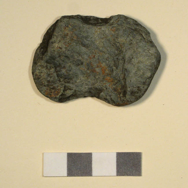 Instrumento lítico usado en faenas de pesca. Tiene forma rectangular irregular, de sección semi plana y bordes redondeados. Tiene dos sacados laterales en el sector central. Está elaborado en piedra tallada y pulida de color gris.