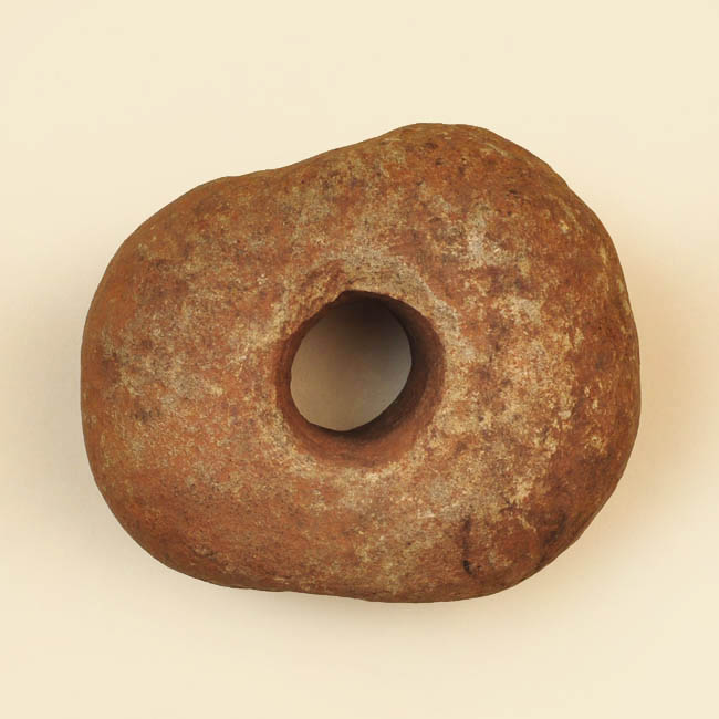 Instrumento lítico de forma semi ovoide, con bordes irregulares y una perforación céntrica completa. De colores gris y marrón, de textura semi lisa.