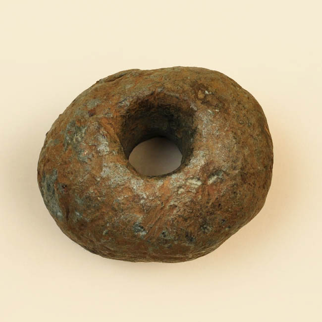 Instrumento lítico con forma de cilindro elíptico, con bordes irregulares y una perforación céntrica completa. De colores gris y marrón, de textura semi lisa.