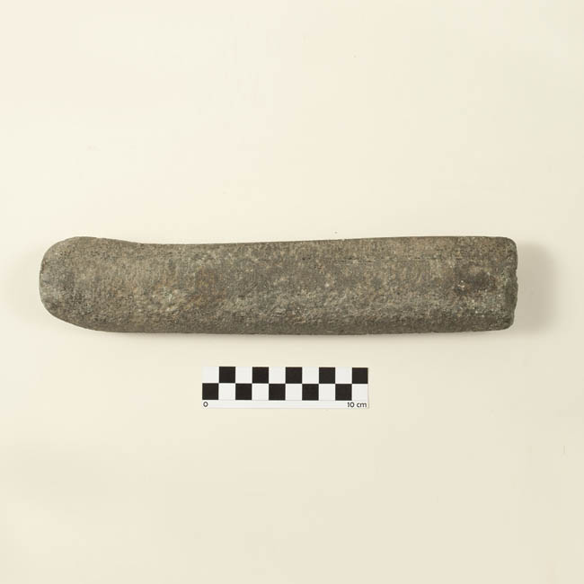 Objeto lítico de forma cilíndrica irregular, presenta un borde redondeado más ancho y otro plano con fracturas. De superficie rugosa y color gris oscuro.