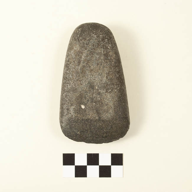 Objeto lítico de forma trapezoidal regular, de sección plana con un extremo redondeado y otro biselado. Está elaborado en piedra tallada y pulida. De color gris oscuro.
