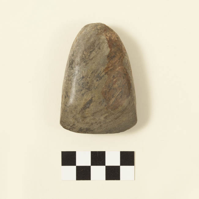 Objeto lítico de forma trapezoidal regular, de sección plana con un extremo redondeado y otro biselado. Está elaborado en piedra tallada y pulida. Color marrón y gris.