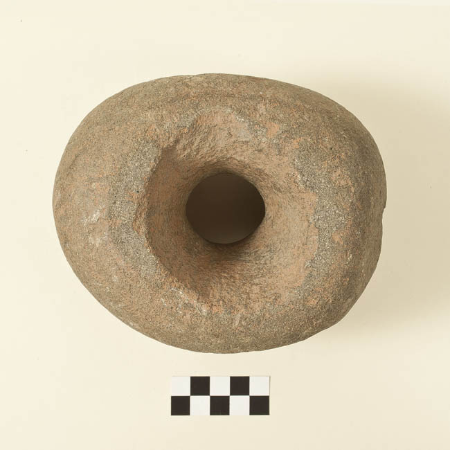 Instrumento lítico de forma esférica achatada. Presenta una perforación bicónica céntrica. Elaborado en piedra pulida y tallada. Superficie semi lisa y rugosa. De color gris.