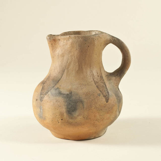 Vasija simétrica restringida con cuello, de perfil inflectado. De cuerpo globular y cuello hiperboloide de borde evertido con vertedero y labio plano. Presenta un asa en arco que se emplaza desde el borde y finaliza en el comienzo superior del cuerpo. Base plana de perímetro circular y en pedestal.