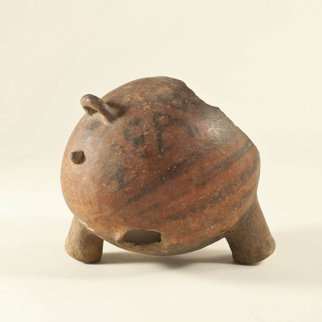 Ceramio zoomorfo de cuerpo globular. Presenta tres protuberancias a modo de patas. En la parte posterior presenta una pequeña asa, y bajo ella, una pequeña protuberancia a modo de cola. De color marrón y decoraciones geométricas negras.