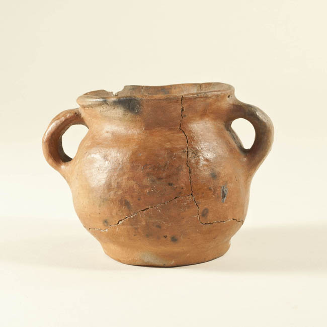 Contenedor cerámico de cuello corto, borde evertido y cuerpo globular con base plana. Posee dos asas anulares de cuello a cuerpo. De superficie alisada color marrón y manchas negras producto del quemado.