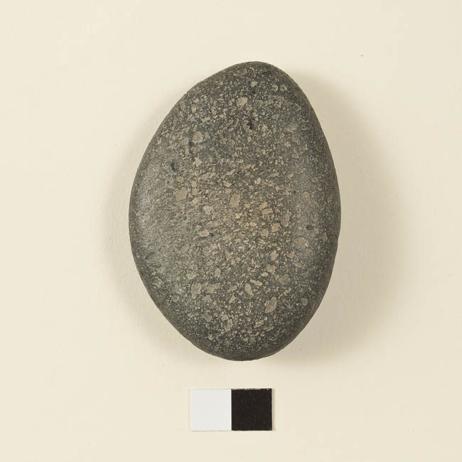 Instrumento lítico de forma elipsoidal regular, presenta caras aplanadas y bordes redondeados. Elaborado en piedra tallada y pulida. De superficie lisa y color gris oscuro.