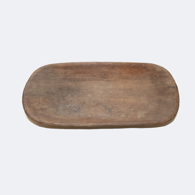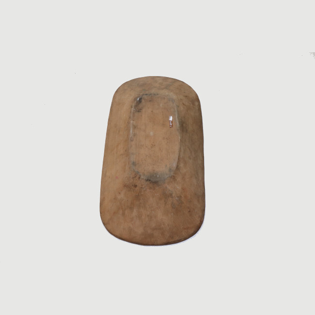 Artefacto tallado en una sola pieza de madera, de superficie alisada color marrón. Los lados paralelos más largos, vistos desde el interior presentan una leve concavidad, éstas se van estrechando hacia el fondo generando una superficie plana por dentro y por el exterior una base plana.