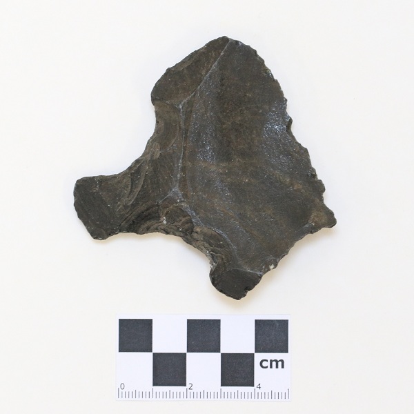 Instrumento lítico tallado y biselado. Está compuesto por un cuerpo en forma de poliedro irregular alargado y un pedúnculo en forma de paralelepípedo de menor tamaño. Su color es negro grisáceo.