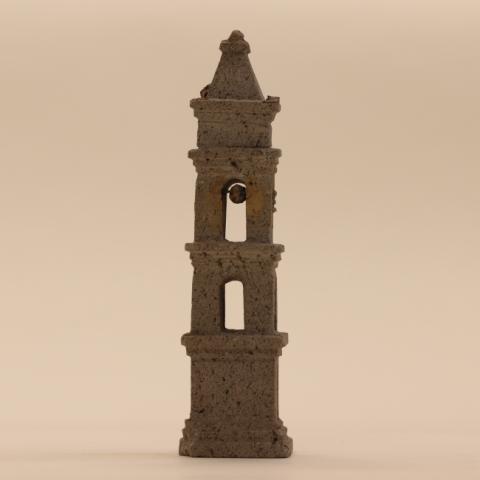 Campanario de piedra volcánica. Está compuesto por cinco secciones donde las dos centrales poseen aberturas a modo de ventana. La tercera sección posee una pequeña campana al centro. La cuarta sección es cerrada y la superior es de forma cónica, con cuatro pequeñas astas en cada esquina.