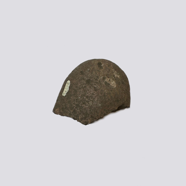 Instrumento lítico de forma semi ovalada, con el borde redondeado y un extremo cortado de forma irregular. Está elaborado en piedra tallada y pulida de color gris.